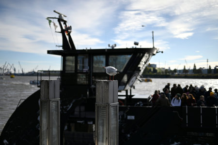 Promenade in the port of Hamburg with a seagull sitting on a railing in front and a harbor tug in the back. People are walking by.
