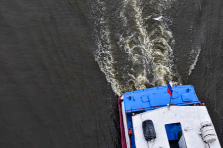 Ship on the Volga River in Nizhny Novgorod, Russia. View from the funicular from the cable car.