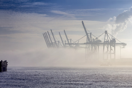 The cranes at the Port of Hamburg on a misty day - CITY OF HAMBURG, GERMANY - DECEMBER 21, 2021