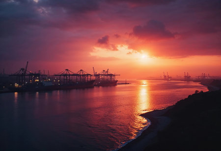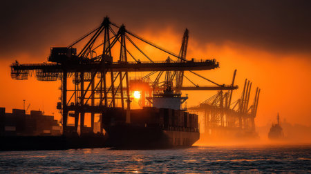 A breathtaking view of a shipping port at sunset, featuring silhouettes of cranes and cargo ships framed against a vibrant orange sky.
