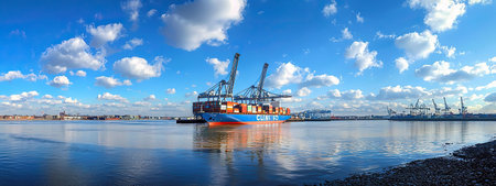 Cargo ship docked at port with cranes unloading containers in industrial setting