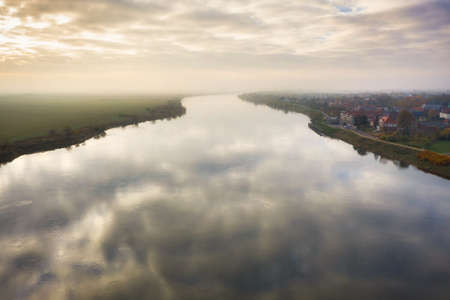 Aerial view to sunset on the river at summer evening with clouds and trees. Water reflection of a sky.