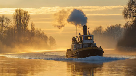 A steam tugboat glides through calm waters at sunrise, surrounded by mist and reflected light. The scene evokes a sense of tranquility and adventure in nature.