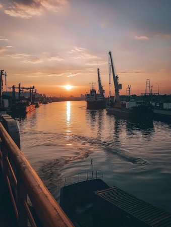 A busy port at dusk, with cranes silhouetted against the orange sky and lights beginning to illuminate the harbor.