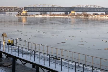 Pier on the Vistula River. The historic bridge over the River Vistula in Tczew. Winter landscape..Poland, Europe.