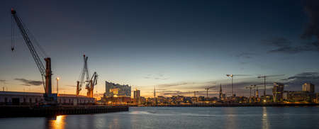 Evening scene in Harbour Hamburg, with shipyard, cranes and container terminals and cruising ships on Elbe River.