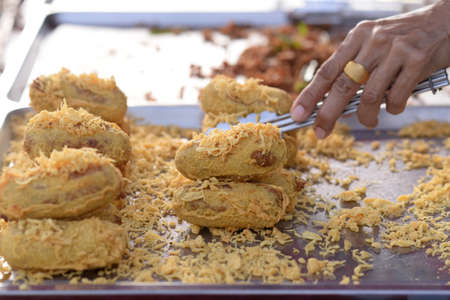 Battered and Deep-Fried Unripe Rice and Grated Coconut Banana Rollsy, Thai dessert.