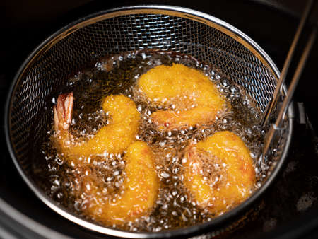 Cooking tempura shrimps in deep fryer. Closeup