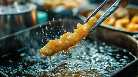 Freshly fried snacks sizzle in hot oil, creating a delightful crispy texture. The steam rises, showcasing the enticing cooking process in a bustling kitchen.