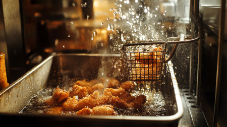Hot oil bubbles energetically around golden-brown fried chicken in a busy diner kitchen, creating a charming rustic atmosphere filled with morning energy.