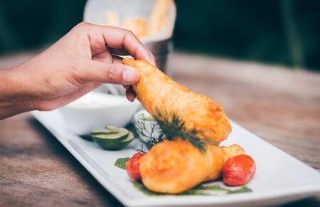 Close up of woman hands holding fried cheese and dipping it into a sauce. Side view. Woman hands are on foreground and on focus, other pieces of cheese and sauces are blurred.