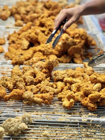Delicious morsels are frying to a perfect golden brown at a lively street food stall.