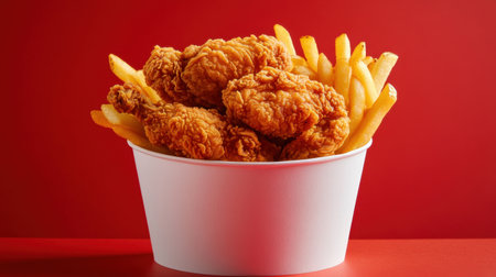 A mouthwatering view of crispy fried chicken pieces accompanied by golden French fries, presented in a white takeout container against a vibrant red background.
