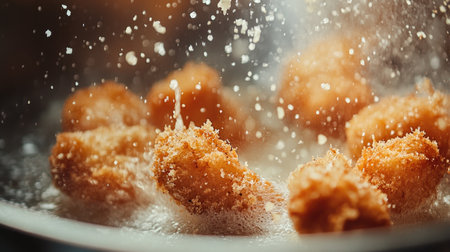 Experience the sizzle of crispy snacks frying in hot oil, capturing the mouthwatering texture and golden color while droplets of oil spray around.