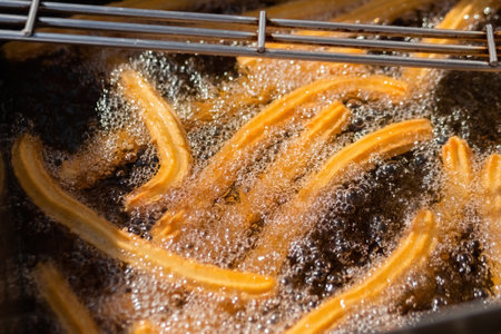 Process of cooking homemade crunchy yellow churros in boiling oil at summer outdoor food market - close up view. Traditional spanich cuisine, cookery, gastronomy, street food concept