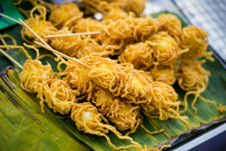 Quail eggs in yellow noodles on local market in Trang. Traditional thai dish made of fresh ingredients.
