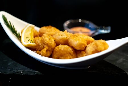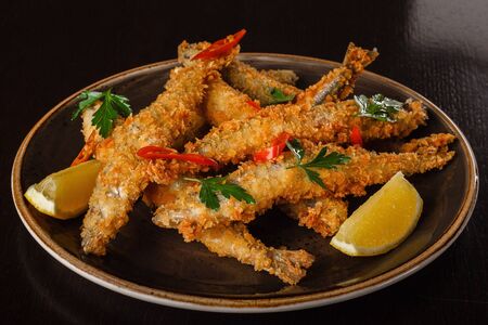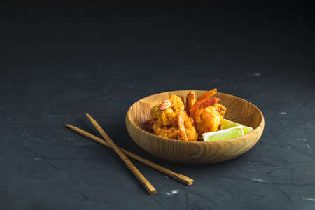 Fried Shrimps tempura with lime in wooden plate on dark concrete surface background. Copy space for text. Seafood tempura dish served japanese or eastern Asia style with chopsticks.