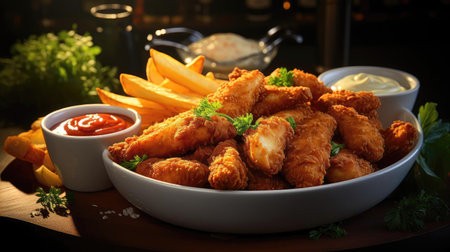 Chicken nuggets served with mayonnaise and ketchup chips, generative AI