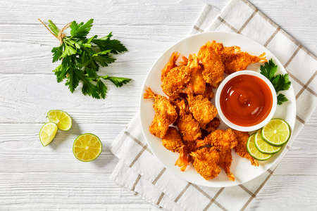 Crispy Fried Breaded Butterfly Shrimps on a white platter with mango ginger sauce and lime slices on a textured white wooden table, horizontal view from above, flat lay