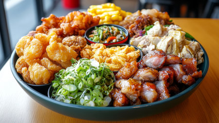 This vibrant platter showcases a variety of delicious Asian dishes, featuring fried chicken, seafood, vegetables, and aromatic herbs, perfect for sharing.