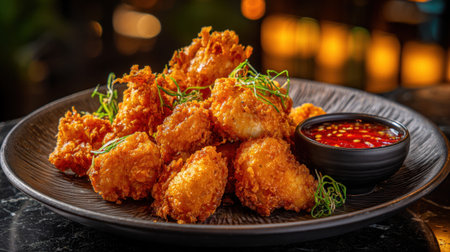 Crispy fried shrimp served with sweet chili sauce on a dark plate.