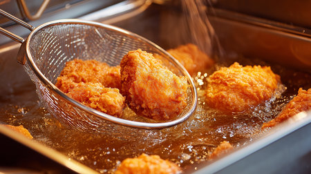 Tender chicken fries in hot oil, forming a golden crust in a bustling kitchen.