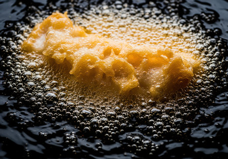 Golden battered food piece deep frying in dark, intensely hot oil. the surface is covered in dramatic, rapidly forming bubbles, highlighting the cooking process.