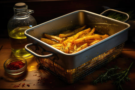 crispy fries in a fryer basket draining oil, created with generative ai