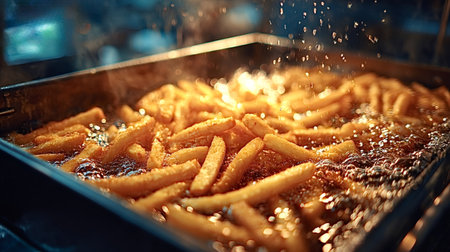 Hot oil splashing over golden French fries frying in a deep fryer, creating a crispy and mouthwatering fast food delight, perfect for snacking during lunch or dinner