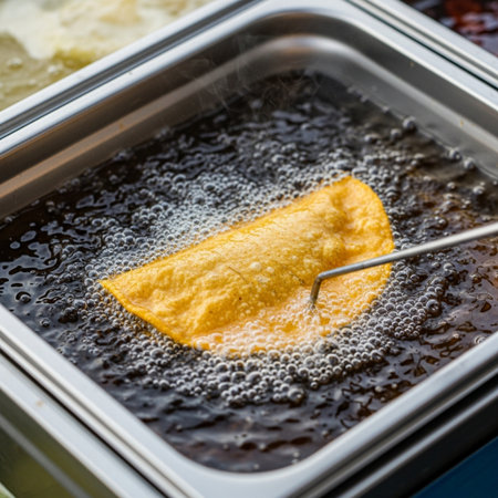Freshly fried snacks sizzle in hot oil, creating a delightful crispy texture. The steam rises, showcasing the enticing cooking process in a bustling kitchen.