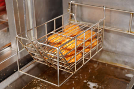 Frying chicken in the deep fryer. Restaurant meal preparation