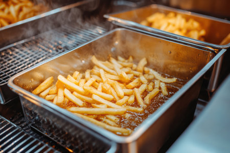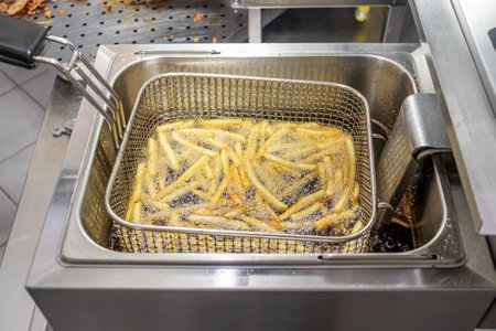 French fries in deep fryer, restaurant kitchen