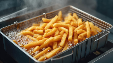 Freshly cooked golden fries sizzle in hot oil, creating a savory snack. The steam rises as the crispy texture promises a delicious taste, perfect for any occasion.