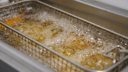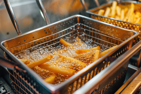 French fries frying in a deep fryer with boiling oil, creating a delicious and crispy treat