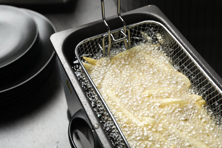 Cod cutlets preparing in deep fryer on table, closeup