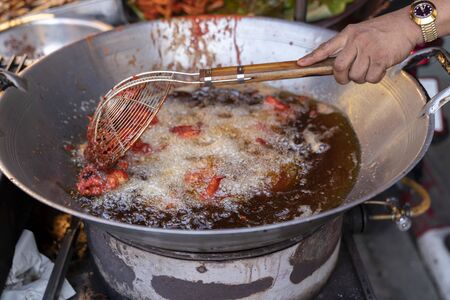 Street food in Thailand. deep-fried chicken using a large frying pan with boiling oil. stirring the chicken with a colander ladle.