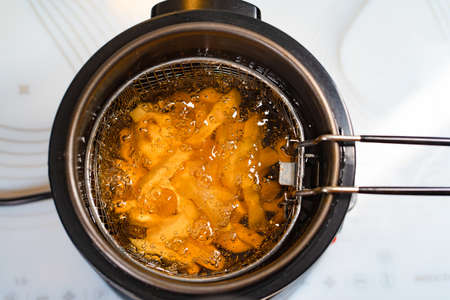 cook French fries. oil boiling in a deep fryer at home. top view. close up.