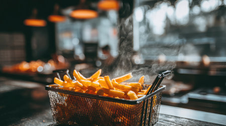 Deep-fried fries in a wire basket with steam rising and blurred kitchen background