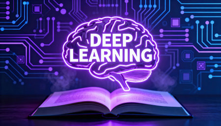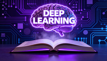 Open book on a dark surface with a glowing neon brain labeled Deep Learning floating above and circuit board background, emphasizing technology and education with copyspace available at top and sides for text or branding