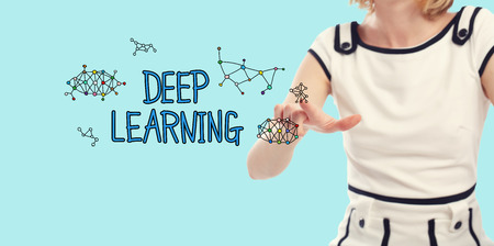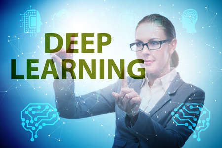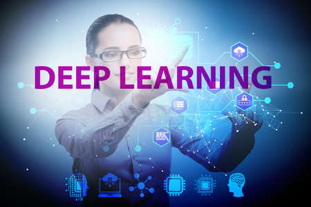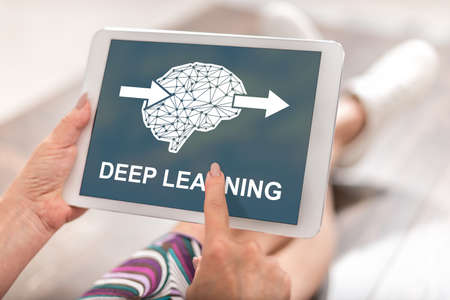 Young business person working on tablet and shows the inscription: DEEP LEARNING