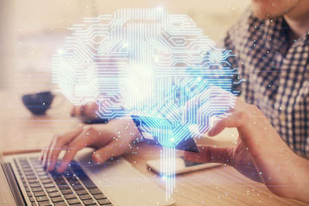 Creative artificial Intelligence concept with human brain hologram on modern laptop background. Multiexposure
