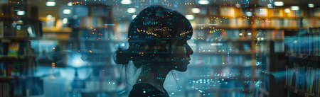 Woman's silhouette merging with a library's digital glow. Fusion of human and information. Concept of digital literacy, knowledge immersion, and futuristic learning.