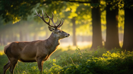 Close-up of a majestic deer with antlers in a tranquil forest during the early morning