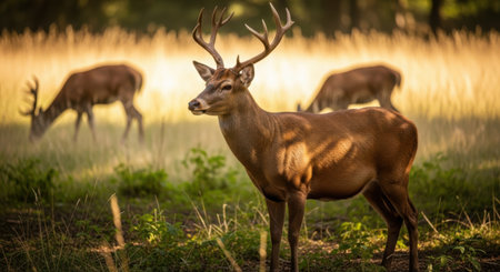 A regal stag with impressive antlers surveys a sun-drenched field as other deer graze peacefully in the background.