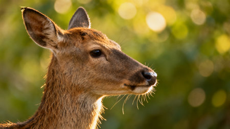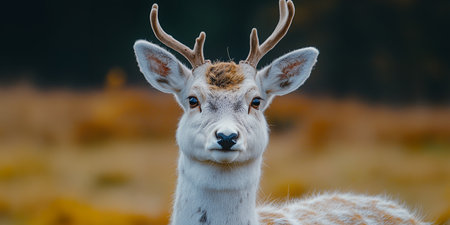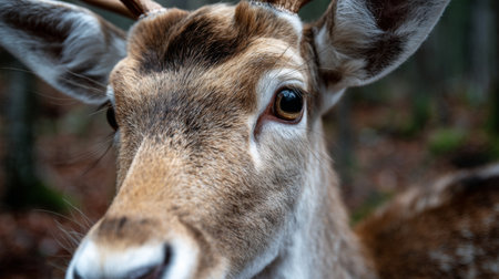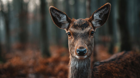 A stunning close-up of a deer showcasing its curious expression and intricate details of its fur. Bathed in soft light, this image captures the serenity of a forest during autumn, highlighting the rich colors and tranquil atmosphere of the woodland habitat. Ideal for nature lovers and wildlife enthusiasts.