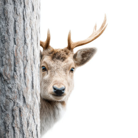 This captivating image features a curious deer peeking from behind a tree, set against a pristine, snowy backdrop, showcasing the beauty of winter wildlife.