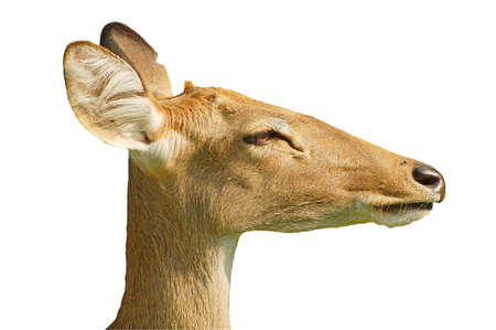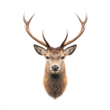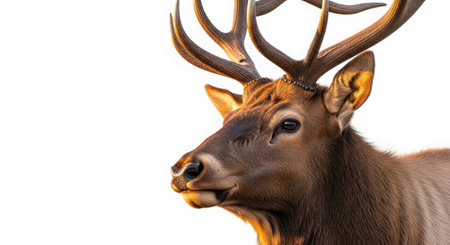 This striking image features a close-up of a majestic deer head with impressive antlers, set against a pure white backdrop, showcasing nature