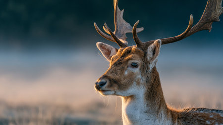 This stunning image captures a male fallow deer with impressive antlers, set against a softly misty forest backdrop during dawn. Perfect for nature lovers.