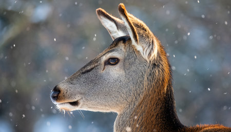 Majestic deer stands proudly in snowy forest during winter snowfall under soft, diffused light