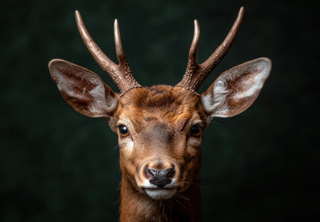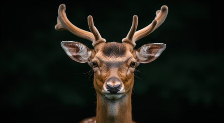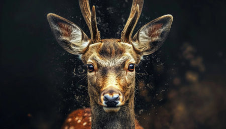 A close-up portrait of a deer with prominent antlers, set against a dark, natural background. The deer's fur is a mix of brown and white, and the lighting highlights its features.